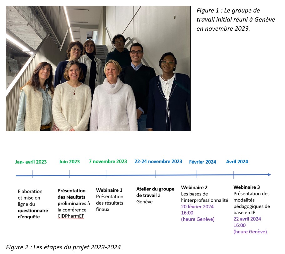 Réuni à l’Institut des Sciences pharmaceutiques de Suisse occidentale à l’Université de Genève du 22-24 novembre 2023 (cf. Figure 1), le groupe de travail initial s’est rapidement consolidé en une communauté qui inclut les professeurs et enseignants impliqués en enseignement interprofessionnel suivants (ordre alphabétique) : Jean-Didier BARDET (France), Nicole BERTIN (France), Anne-Laure BLANC (Suisse), Marie-Claude BOIVIN (Canada), Luigi FLORA (France), Guillaume HACHE (France), Julie HASEBAERT (France), Audrey JANOLY-DUMENIL (France), Stéphane MUNCK (France), Patricia PICCHIOTTINO (Suisse), Audrey RAYNAULT (Canada), Carole ROGNON (France), Florence SOUARD (Belgique), Annie STANDAERT (France), Estelle Noëla Hoho YOUL (Burkina Faso). Marie Schneider (Suisse) et Marie-Claude Vanier (Canada) assurent la co-présidence du groupe de travail, et Beatrice KAUFMANN (Suisse) et Jean-Luc VEUTHEY (Suisse) soutiennent sa coordination.